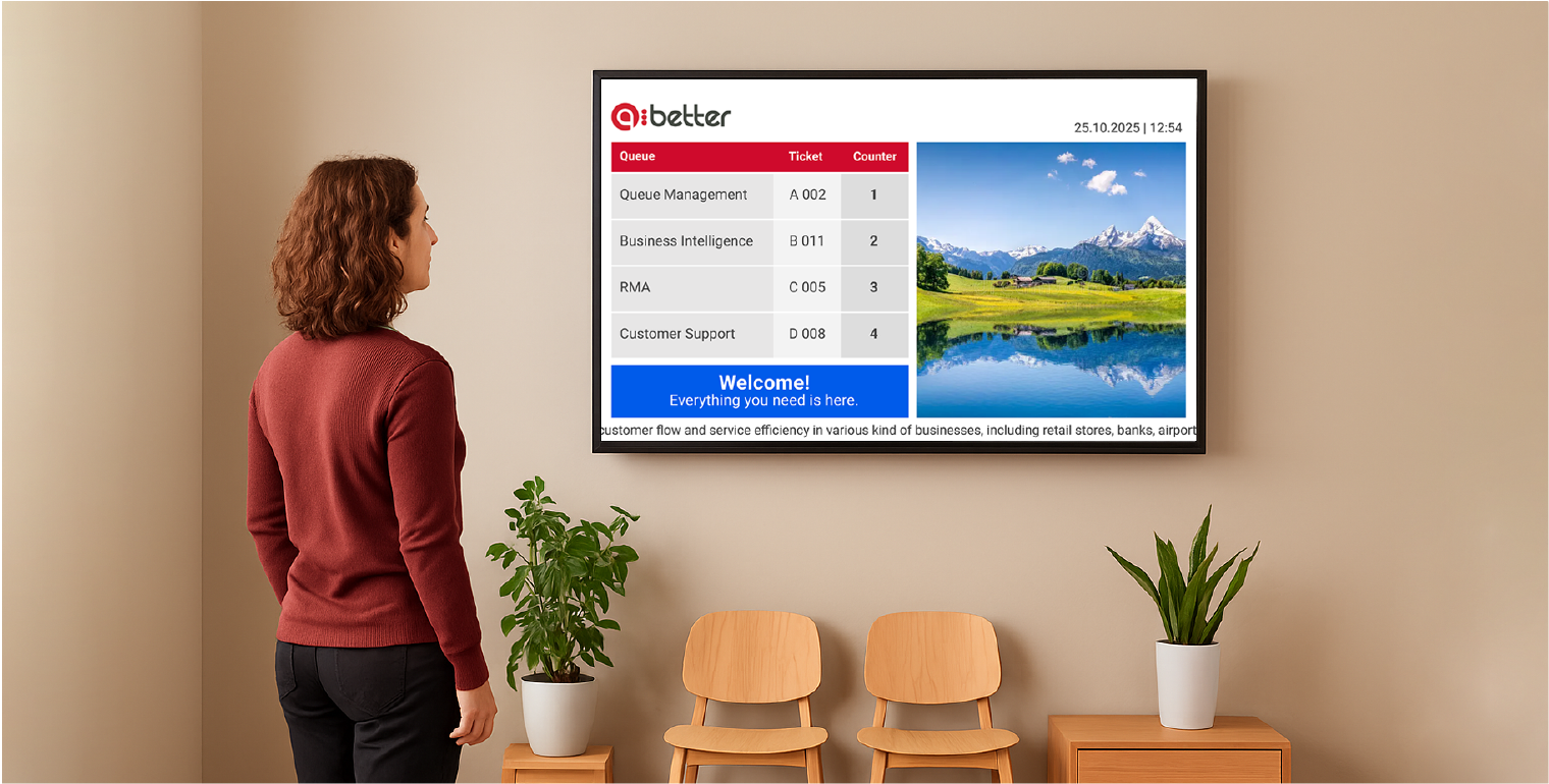 Inform, entertain, and advertise to your customers, turning their waiting time into a pleasant experience. Display multimedia content while keeping customers informed about the queue status. Easy integration with your current digital signage system.